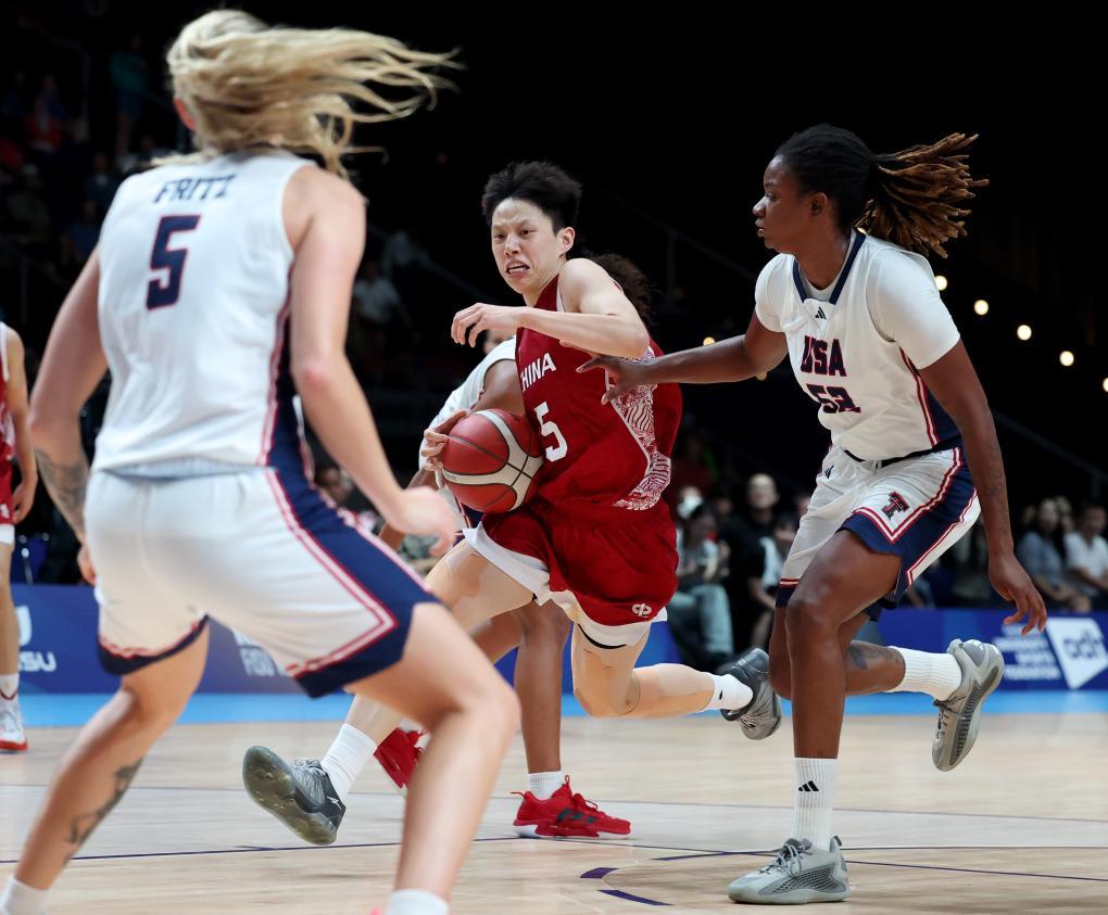 7月25日,中國隊球員田媛媛(中)在2025年德國萊茵-魯爾世界大學生夏季運動會女籃決賽中帶球突破。新華社記者 張晨 攝