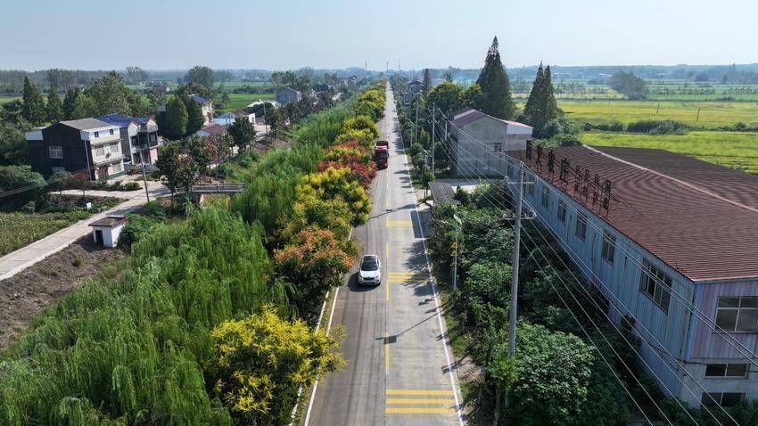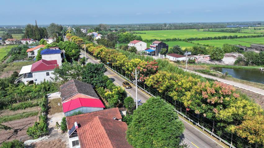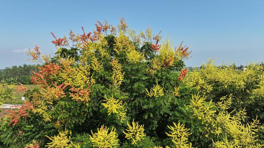 航拍鏡頭下,S480省道久合垸路段宛如一條彩帶穿梭在鄉村之間。道路兩旁,欒樹花開得正盛,金黃、粉紅的花朵在枝頭層層疊疊,秋風拂過,仿佛無數彩色的小鈴鐺在枝頭搖曳,熠熠生輝。數百棵紫薇花也不甘示弱,或粉或紫的花朵簇滿枝頭,與欒花交相輝映。車輛行駛在這條“色彩大道”上,行人漫步于花樹之下,真可謂“人車畫中行”。