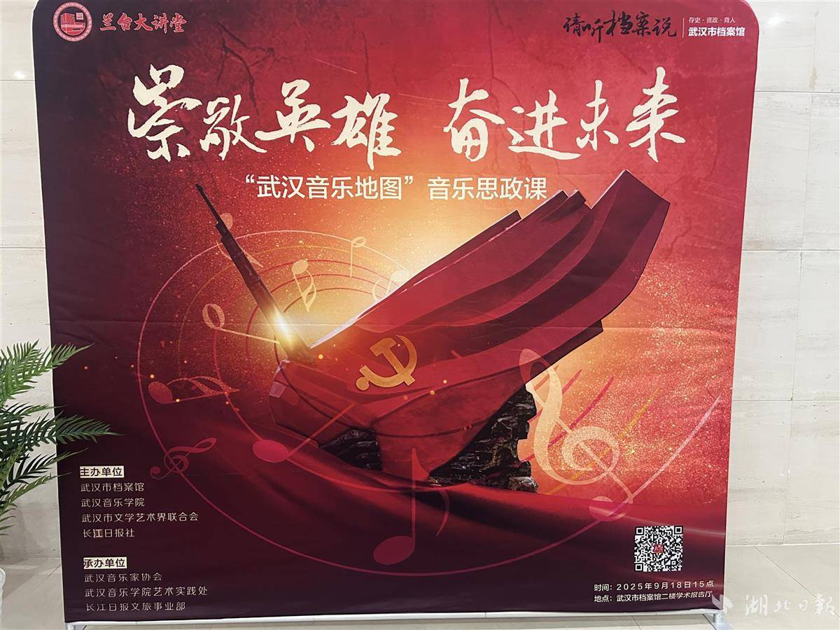 湖北日報訊(記者湯煒瑋、通訊員彭皓亮)9月18日,崇敬英雄奮進未來——“武漢音樂地圖”思政課在武漢市檔案館舉行。本次活動由武漢市檔案館、武漢音樂學院、武漢市文學藝術界聯合會等單位共同主辦。