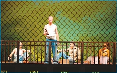 坐滿觀眾的劇場,大幕拉開,燈光追隨,被判謀殺罪的銀行家安迪由獄警押解上場。身后的鐵牢籠里傳出起哄聲:“看吶,來新人了!”……