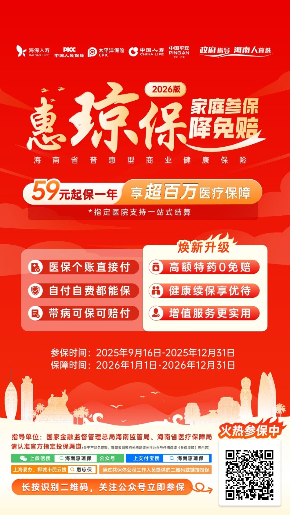 目前,“惠瓊保”2026版已開放參保,即日起,海南省基本醫療保險參保人、海南省內定居且辦理居住證的人員、具有海南本省戶籍的人員、持有海南身份證的人員、海南掛職人員、被認定為海南省高層次人才的人員、新市民、靈活就業人員,上述人員均可關注官方參保平臺“海南惠瓊保”微信公眾號,為本人及其父母、配偶、子女統一辦理參保,也可以通過支付寶、海易辦、海南農商行、云閃付、椰城市民云在線參保,另外還可以通過13家共保體公司的專業工作人員咨詢參保。