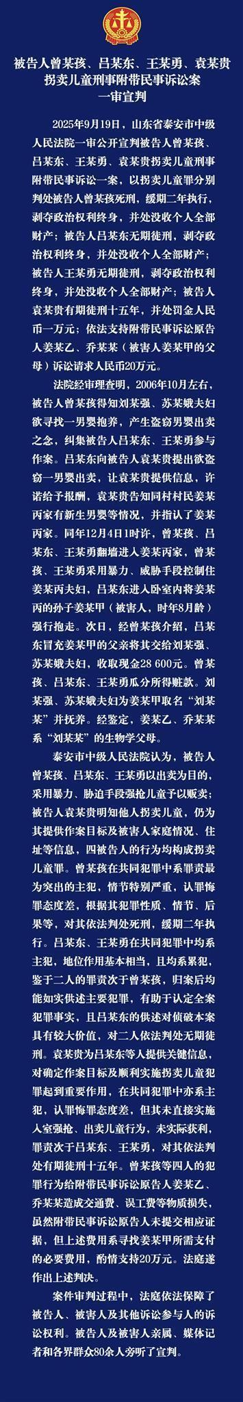 9月19日上午,發生于18年前的“山東入室搶嬰案”,在泰安市中級人民法院一審宣判。分別判處被告人曾某孩死刑,緩期二年執行,被告人呂某東、王某勇無期徒刑,被告人袁某貴有期徒刑十五年。依法支持附帶民事訴訟原告人訴訟請求人民幣20萬元。當年被搶嬰兒姜甲儒及其父母在接受極目新聞記者采訪時介紹,在聽到死緩的判決后,被告人曾某孩完全“破防”,還對他們以及法官等眾人破口大罵,態度十分囂張。