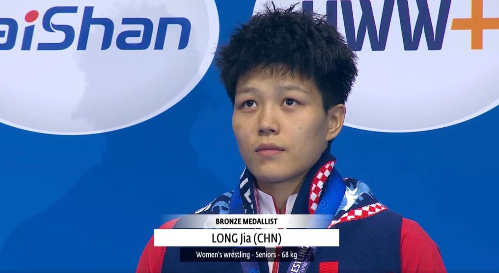 龍佳在2025摔跤世錦賽女子68公斤級頒獎典禮上