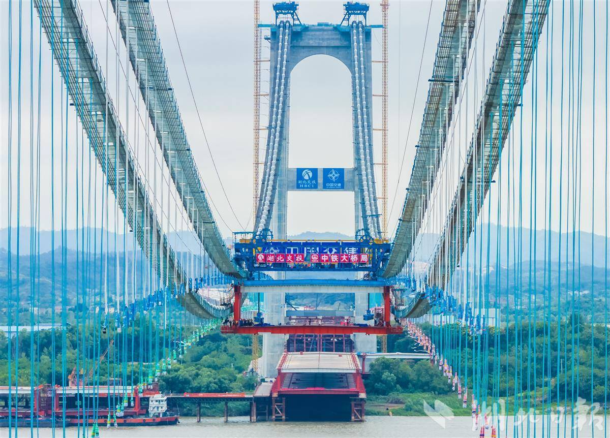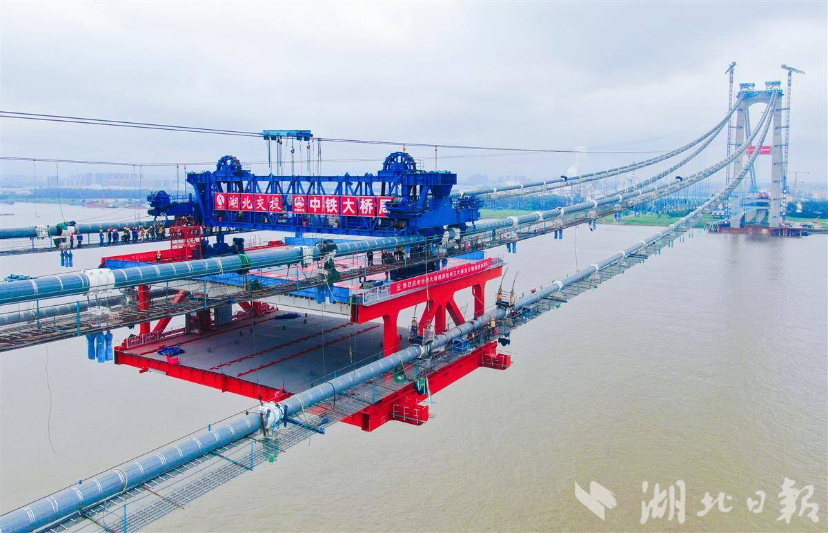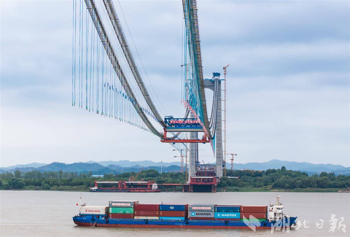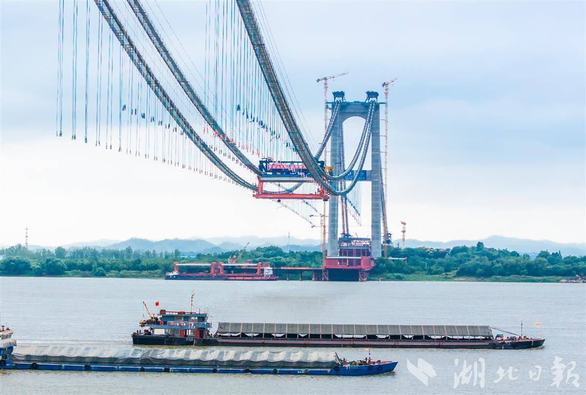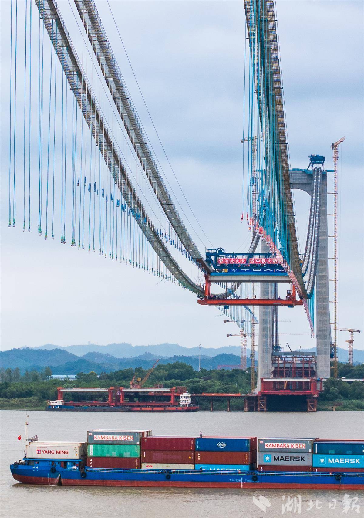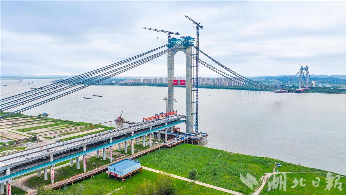 燕磯長江大橋連接湖北鄂州和黃岡,是鄂州國際物流核心樞紐的綜合配套工程,預計今年年底完成鋼梁架設。(湖北日報全媒記者 薛婷 通訊員 張靜 王洪松 王小梅 攝)