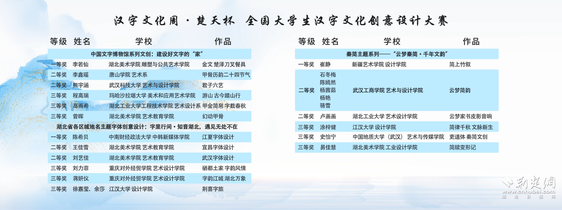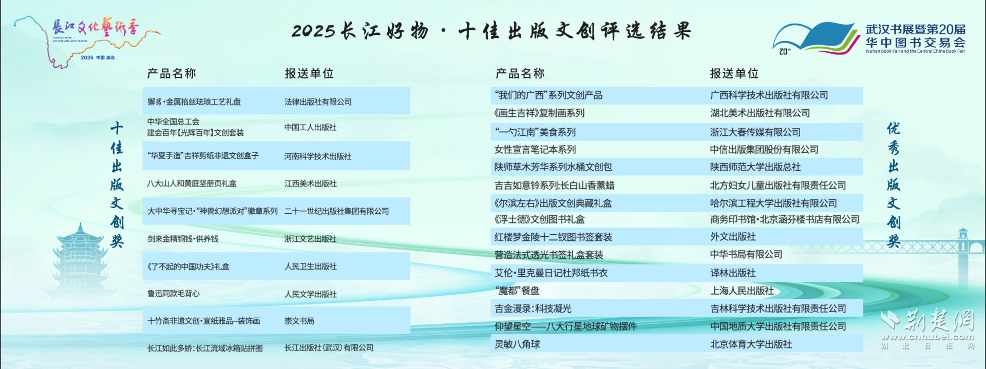 活動現場,首屆“漢字文化周·楚天杯”全國大學生文化創意設計大賽和“長江好物系列評選”的獲獎作品發布與頒獎環節備受矚目。湖北省新華書店(集團)有限公司黨委委員、副總經理柏濤、漢字文化周活動組委會主任楊文博為大學生大賽獲獎者頒獎,年輕創作者們以創新思維融合漢字文化與現代設計,展現無限創意潛力;中國出版傳媒商報社副總經理倪成、湖北省曲藝家協會主席陸鳴為“長江好物”獲獎單位和個人頒獎。獲獎作品涵蓋多個領域,體現長江流域文化內涵與藝術魅力,為產業發展樹立標桿。