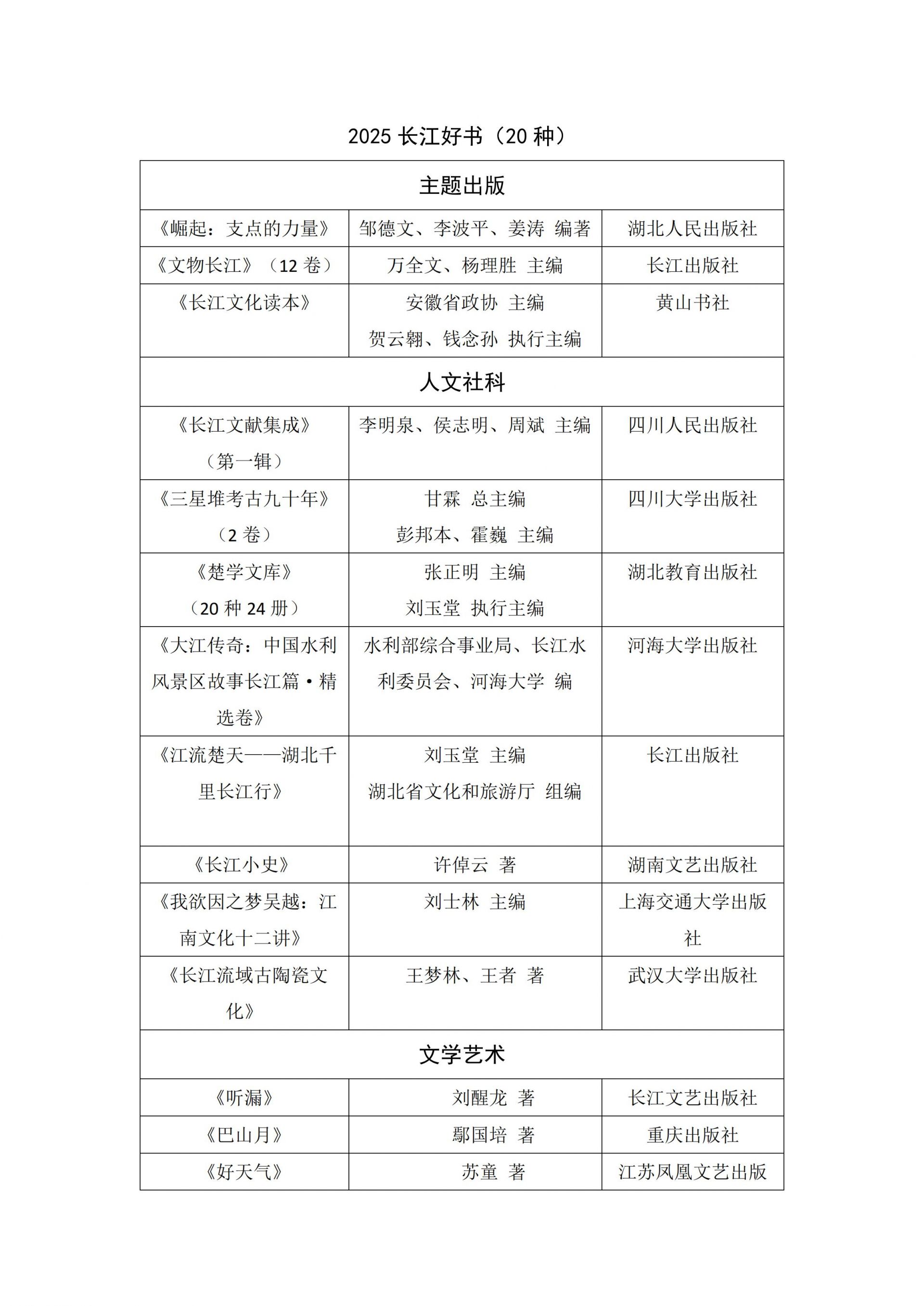 此次活動共收到60多家出版單位推薦的220多種好書、新書,包含主題出版、人文社科、文學藝術、科技生活、少兒教育等5個品類。經初評、復評、終評層層推薦遴選,最終20種圖書脫穎而出,獲評2025“長江好書”。這些圖書兼具思想性、文化性與可讀性,全方位展現長江文明的多元魅力,共同構成了一幅立體的長江文化畫卷,為不同年齡段、不同閱讀需求的讀者提供了豐富選擇。