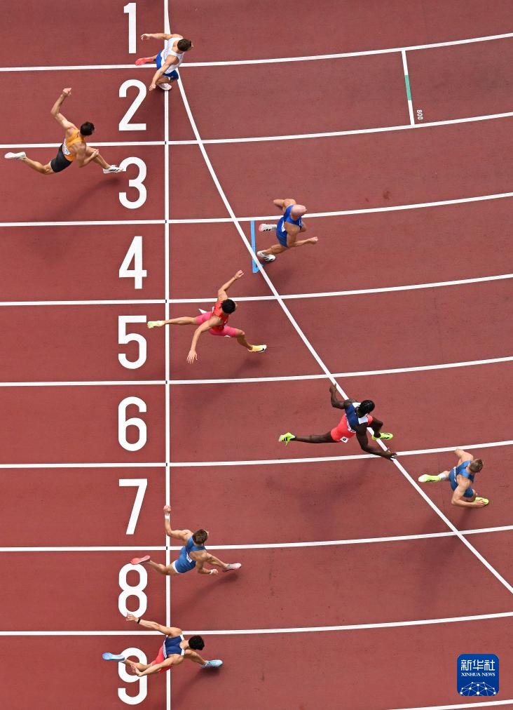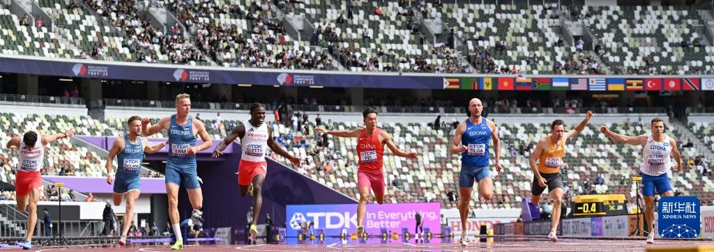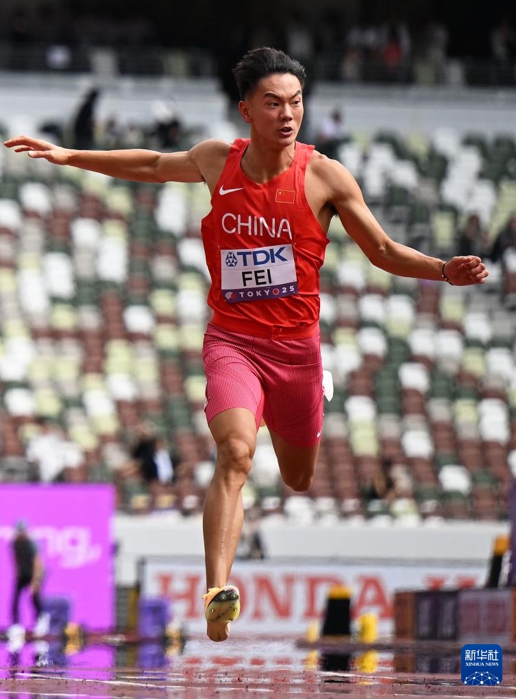 9月20日,中國選手費(fèi)翔在100米比賽中沖過終點(diǎn)。
