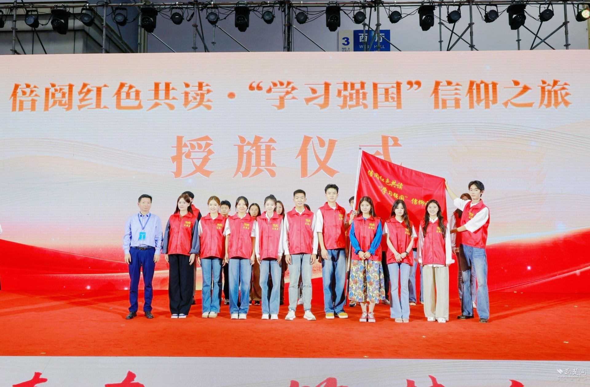 省委講師團主任姚亭華向大學生代表授予“紅色共讀·信仰之旅”旗幟,象征紅色精神薪火相傳。
