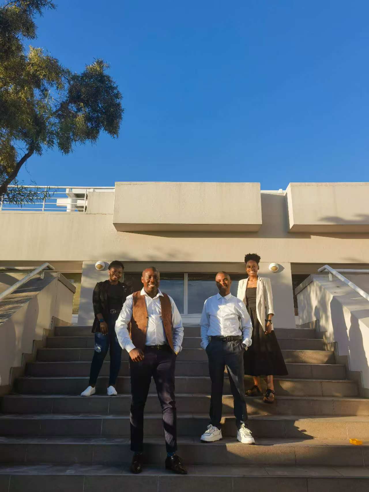 4位主播在南非跨境電商產(chǎn)業(yè)園前合影,前排左一文信杰,右一馬恩。長江國貿(mào)供圖