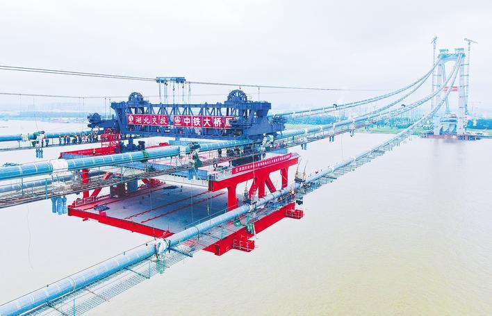 9月20日,黃岡與鄂州之間的長江江面上,隨著一節(jié)長28.4米、重830噸的鋼梁由纜載吊機緩緩提升至設(shè)計位置,燕磯長江大橋主跨首節(jié)鋼梁吊裝完成。這標(biāo)志著我國首座大跨度四主纜懸索橋建設(shè)邁入鋼梁架設(shè)階段,預(yù)計今年年底完成全部鋼梁架設(shè)。(湖北日報全媒記者 薛婷 張燦 通訊員 張靜 王洪松 攝)