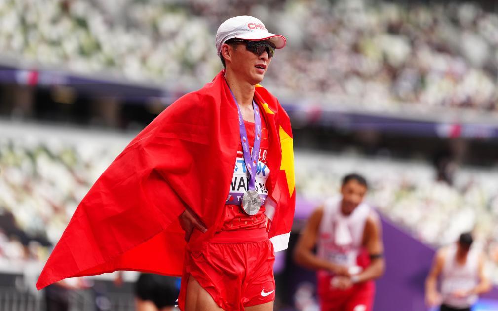 9月20日,中國選手王朝朝在男子20公里競走比賽后。新華社記者 賈浩成 攝