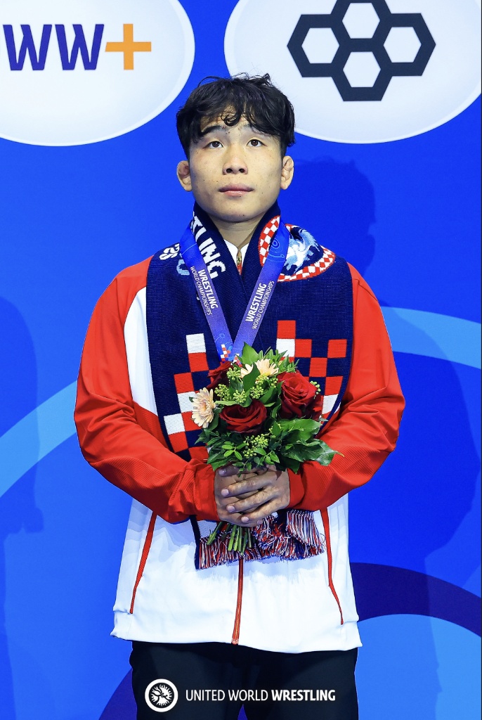 施鈥應在2025年摔跤世錦賽男子古典式55公斤級頒獎典禮上。圖片來自世界摔聯官網