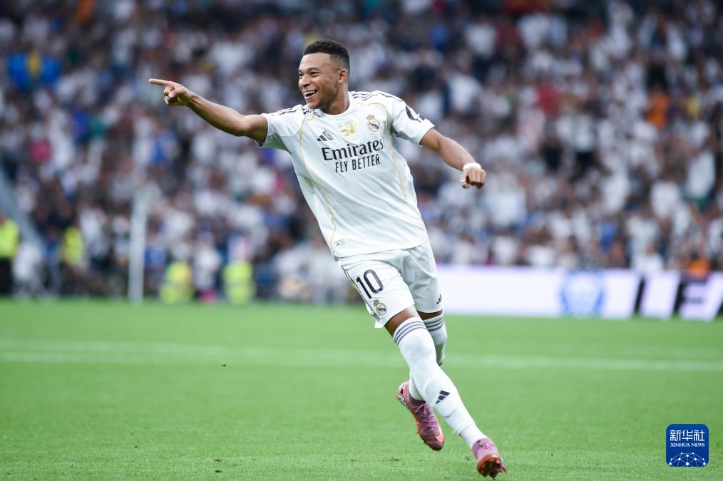 9月20日,皇家馬德里隊球員姆巴佩在比賽中慶祝進球。