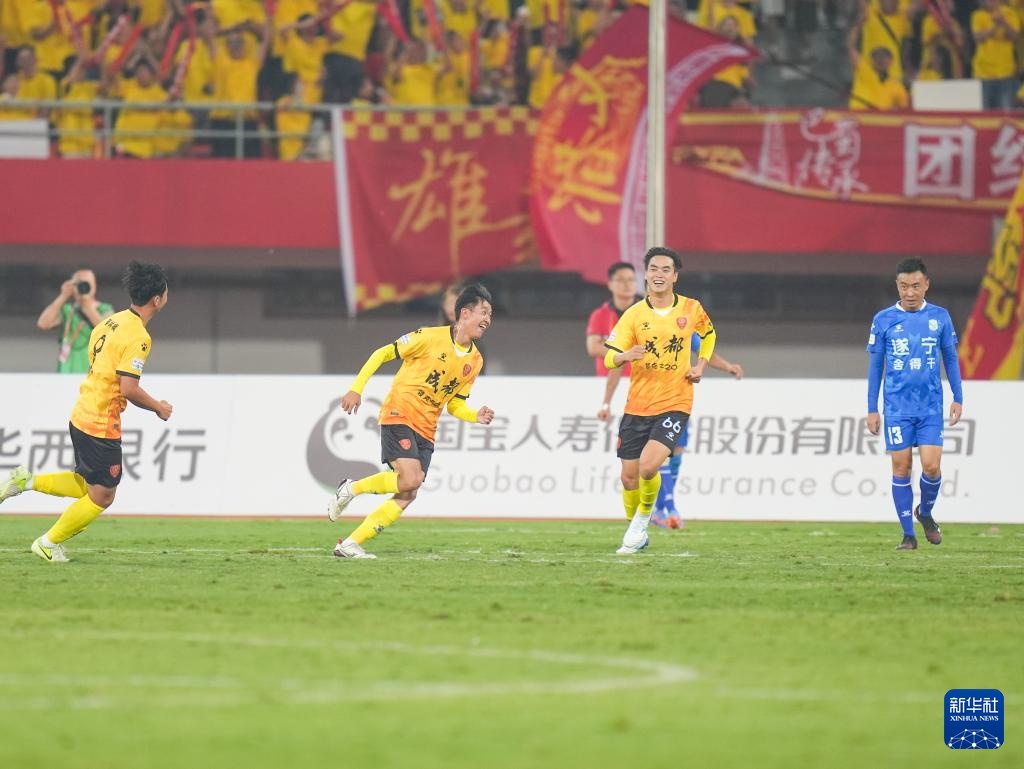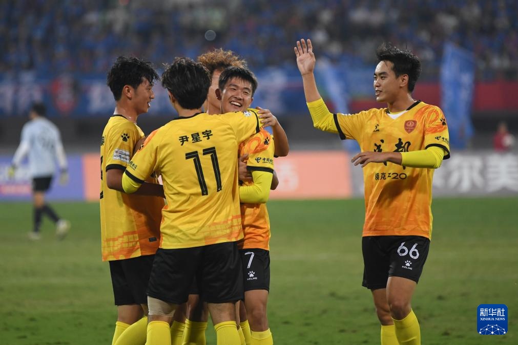 9月20日,成都錦城隊球員在比賽中慶祝進球。