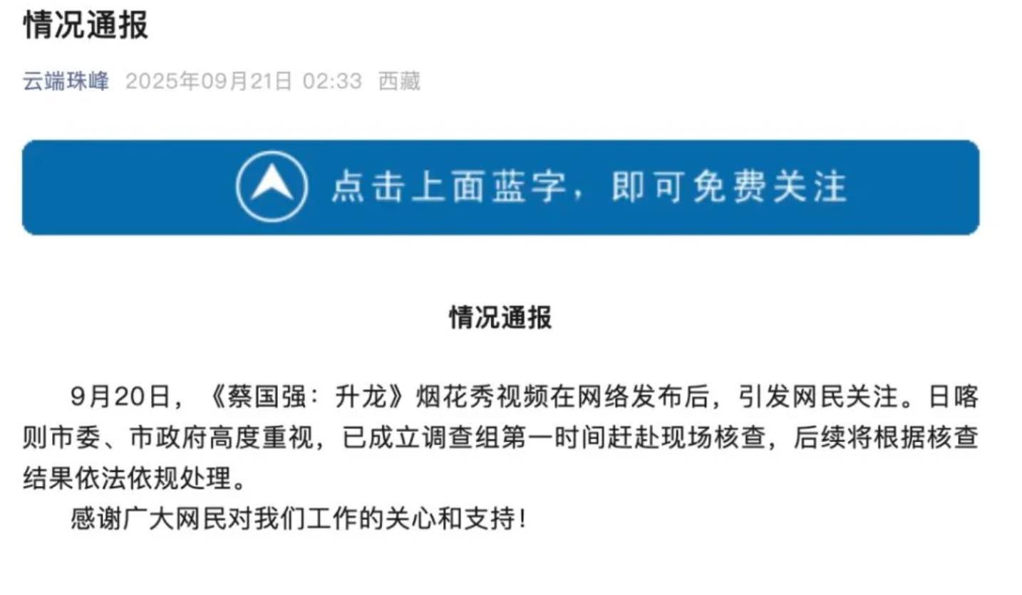 21日凌晨2時許,“云端珠峰”發布情況通報稱:日喀則市委、市政府高度重視此事,已成立調查組第一時間趕赴現場核查,后續將根據核查結果依法依規處理。隨后,始祖鳥品牌和蔡國強工作室先后就此事致歉。(據9月21日極目新聞)