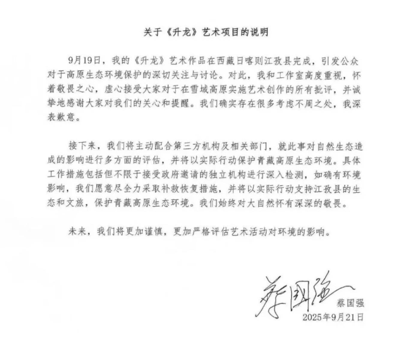 9月19日傍晚,戶外品牌始祖鳥聯手藝術家蔡國強在喜馬拉雅山脈舉辦了煙花表演《升龍》,掀起巨大爭議。