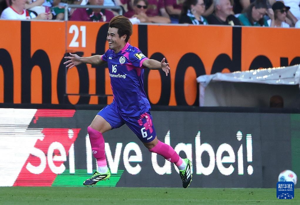 9月20日,美因茨隊球員佐野海舟在比賽中慶祝得分。