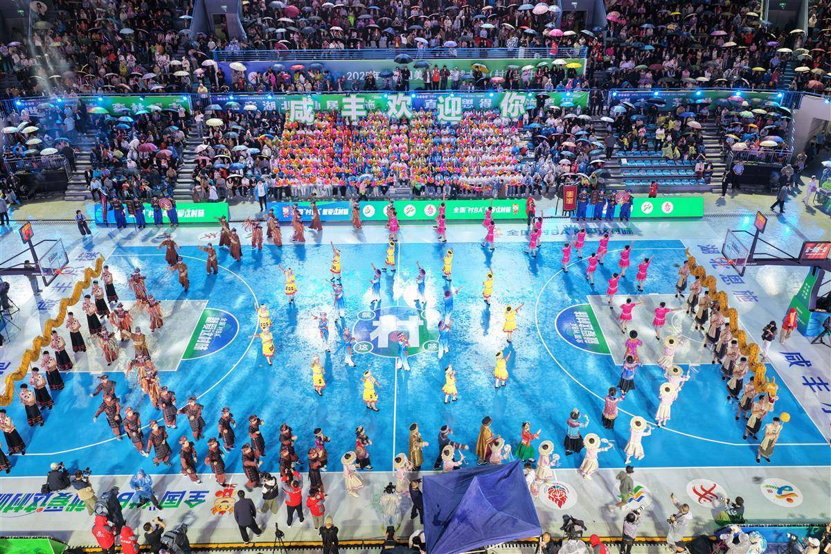 開幕式在極具土家族特色的《土家迎客歌》與《六口茶》歌舞中拉開帷幕,以濃墨重彩的文化筆觸繪就全國“村BA”以賽促文、以文興村的振興圖景。整場文藝展演分為“土苗風(fēng)韻”“八方來客”“直尕思得”三大篇章。《鼓舞咸豐》《咸慶豐年》《來的都是客》等節(jié)目深度融合非遺文化、農(nóng)耕記憶與民族歌舞,生動展現(xiàn)鄂西南地區(qū)深厚的文化底蘊(yùn),彰顯出“村BA”在培育鄉(xiāng)風(fēng)文明、凝聚群眾力量、促進(jìn)全民健身中的重要作用。