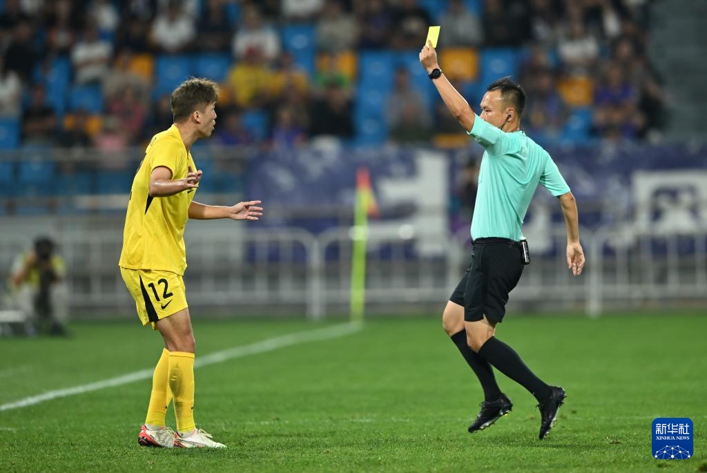 9月21日,主裁判王競(右)向深圳新鵬城隊球員張曉彬出示黃牌。