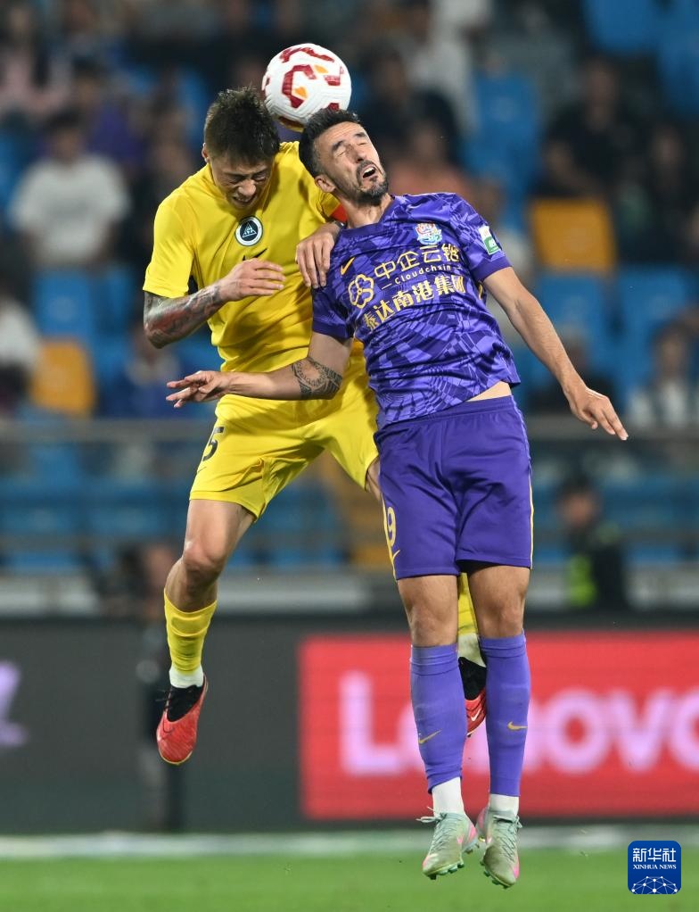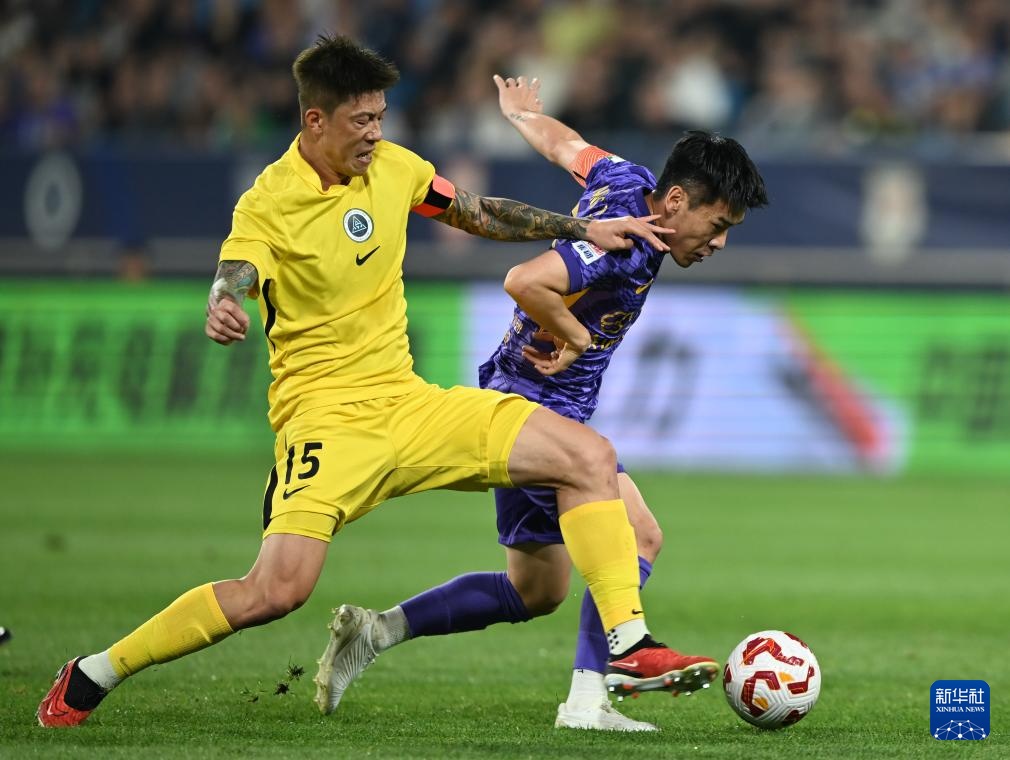 9月21日,天津津門虎隊球員基萊斯(右)與深圳新鵬城隊球員于睿在比賽中拼搶頭球。
