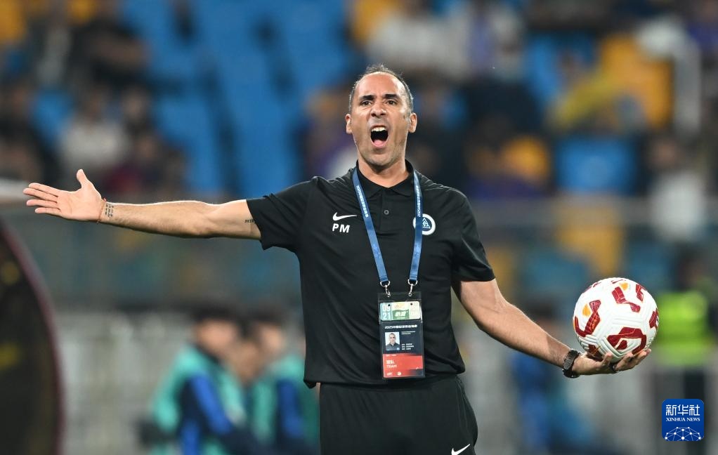 9月21日,深圳新鵬城隊主教練穆尼奧斯在比賽中向邊裁申請球隊球權。