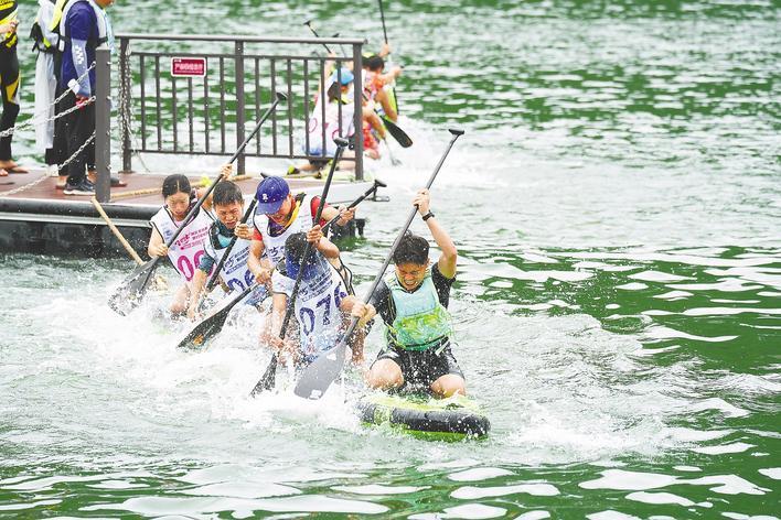 大清江紅花峰林站設(shè)置成人4公里、青少年2公里和親子3人200米三項競速賽,5對5槳板拔河賽,3對3槳板球?qū)官惖软椖?,還創(chuàng)意整合了飛拉達(dá)攀巖、紅花峰林健步行等活動。這場水、陸、空三位一體的戶外賽事盛宴,吸引了全國數(shù)百名戶外運動愛好者參與。