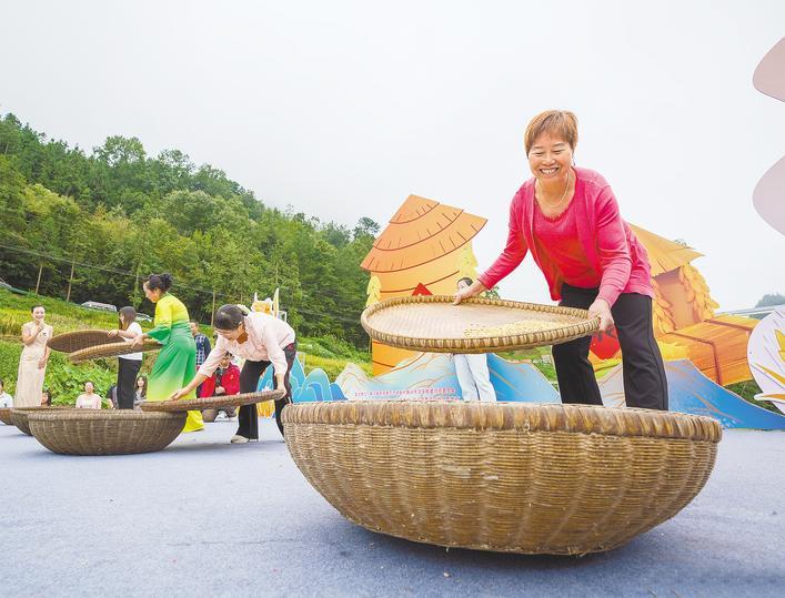 “又慶豐收兮,開鐮咯!”村民代表宋文興以悠揚的頌詞為豐收開鐮。隨后,非遺表演、趣味運動會等環(huán)節(jié)精彩不斷。“團隊割稻”項目中,三人一組協(xié)作,兩人割稻、一人摔打脫粒,額頭汗珠充盈卻伴著喜悅;“抗旱保苗”挑水接力賽中,稀泥緊抱著小腿,晃得水花四濺卻誰也不肯灑出一滴;豆谷分離比拼時,簸箕一抖一揚間,黃豆玉米自動分離。農(nóng)耕體驗區(qū)成為親子家庭的樂園,孩子們赤腳跳進泥田抓雞摸泥鰍,父母則手把手教孩子握鐮割稻,講述“米從何處來”的故事。