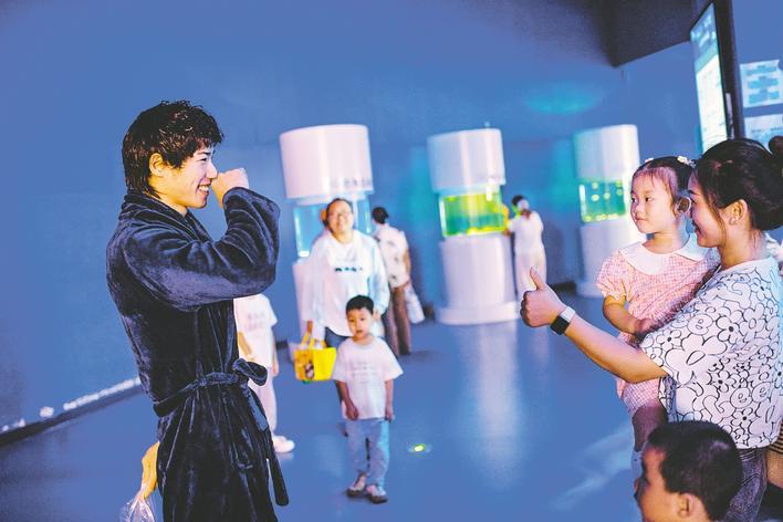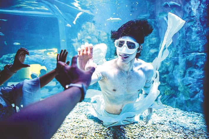 碧藍(lán)的水池中游進(jìn)兩條“美人魚”,男版美人魚身穿特制魚尾泳衣在水中舞動(dòng),動(dòng)作流暢絲滑,肌肉線條優(yōu)美;而他的女搭檔身姿曼妙,體態(tài)輕盈。他們與魚共舞,展現(xiàn)出優(yōu)雅與靈動(dòng),引得觀眾連連驚嘆。演出結(jié)束,兩名美人魚在水里比畫愛(ài)心,送出飛吻,與觀眾互動(dòng)。觀眾中多數(shù)是女性和兒童,他們也用鏡頭和手勢(shì)向美人魚做出回應(yīng)。“我們專程為看‘男美人魚’而來(lái)。”帶著孩子的觀眾王女士說(shuō)。目前,這項(xiàng)演出已經(jīng)成為該館的熱門表演項(xiàng)目。