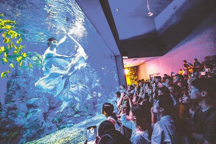 銷品茂海洋館里,肖淞譯扮演的美人魚一亮相,就吸引了觀眾舉起手機(jī)拍攝。