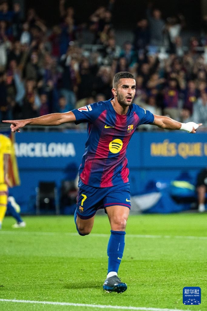 9月21日,巴塞羅那隊球員費蘭·托雷斯在比賽中慶祝進球。