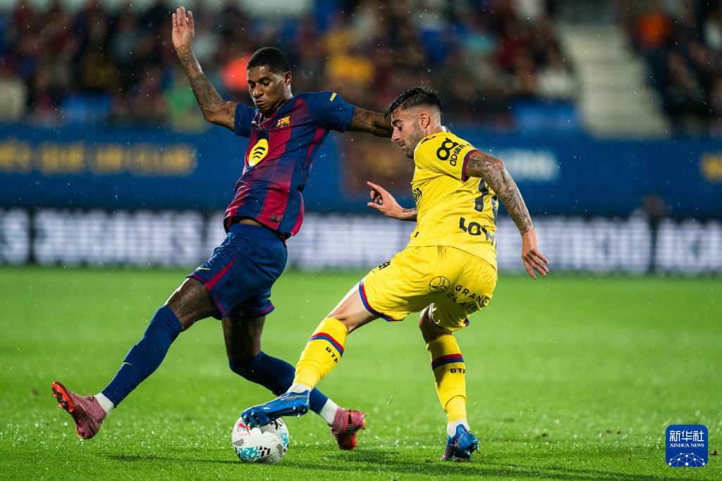 9月21日,巴塞羅那隊球員拉什福德(左)與赫塔菲隊球員??死锼乖诒荣愔衅磽?。