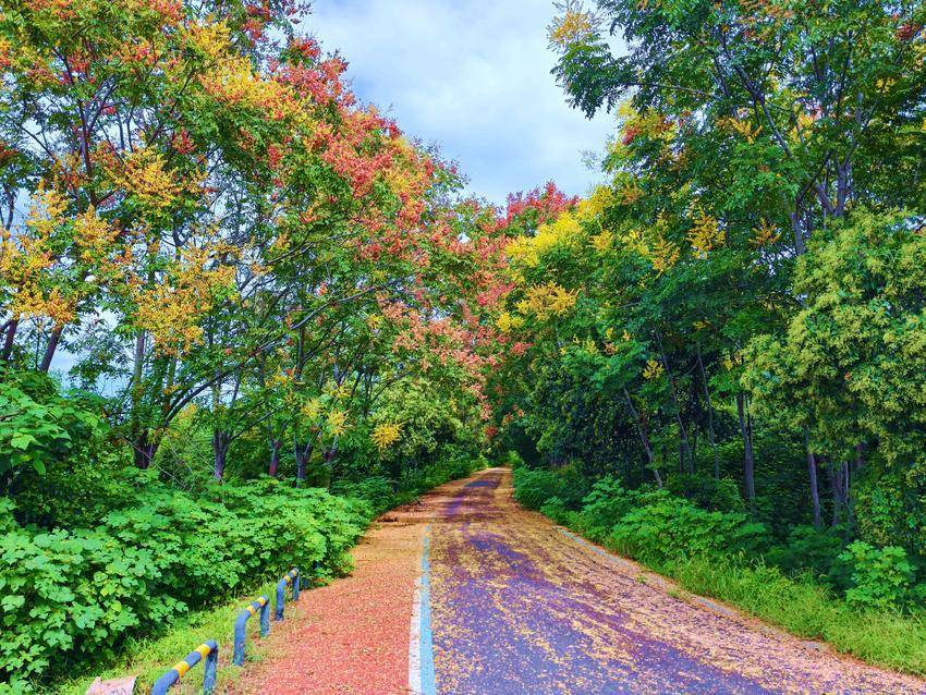 綠道上,欒樹綠油油的枝葉、金燦燦的花蕊、紅通通的燈籠果,還有那鋪滿一地的金色地毯,讓條條幽徑流淌著舒緩的童話般的音符。叢林間、小徑旁,木槿花依然蓬勃綻放。