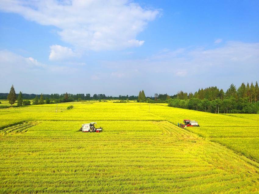 一望無垠的大地,金色的稻田流動著紅色的收割機,黃澄澄的稻谷猶如農民無法掩飾的笑聲、掌聲、歡呼聲。