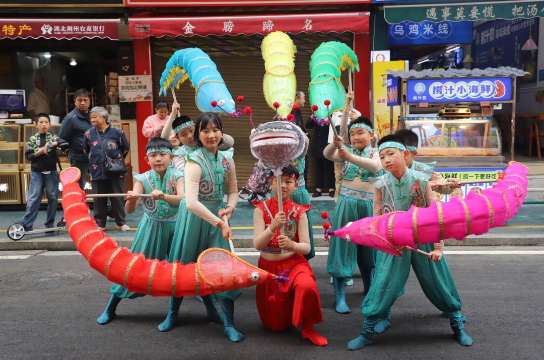 上午9時,活動在孩子們歡快的非遺表演“五蝦鬧鲇”中拉開序幕。美食街入口處,10米高的“中秋圓月”主題燈組與國旗長廊相映生輝,成為游客爭相打卡的熱門場景。主通道燈籠高掛、彩帶飄揚,沿街商戶統一張貼“雙節尋味”主題海報,節日氛圍瞬間拉滿。