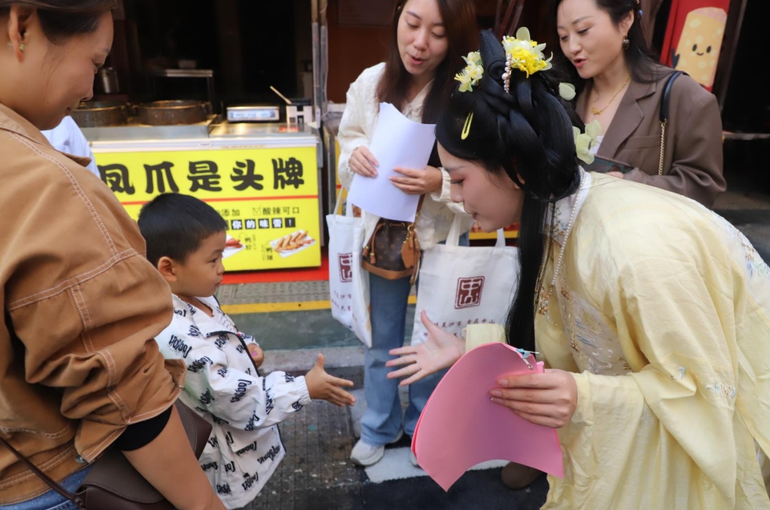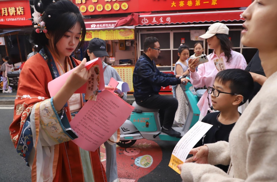 “猜謎”游戲區人氣火爆。游客在指定商戶消費即可獲得游戲券,與身著漢服的工作人員互動猜謎。謎題融合了中秋傳統、國慶主題與荊州美食文化,猜中者可獲得手工月餅或精美小禮品,傳統文化以輕松有趣的方式深入人心。