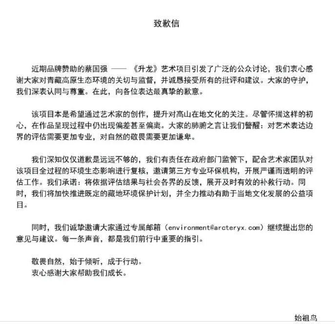9月20日,戶外品牌始祖鳥聯手以火藥爆破作品成名的藝術家蔡國強,在喜馬拉雅山放煙花的事件,引發爭議。9月21日,始祖鳥、蔡國強工作室在社交平臺發布致歉信。