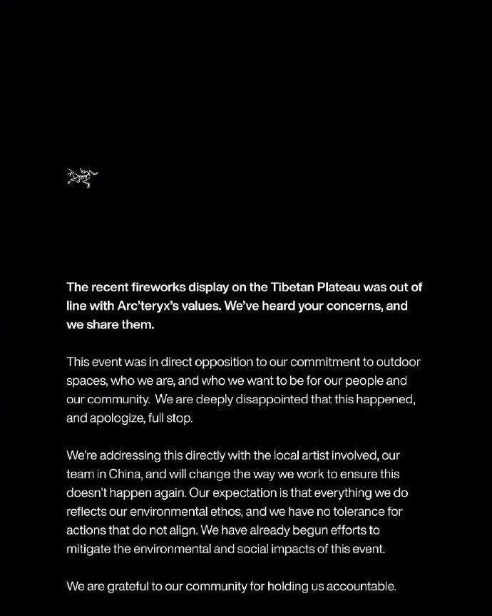 而海外版的道歉信則換了一種表達方式,海外版稱,對青藏高原煙花表演深感遺憾,此行為與品牌環保價值觀及期望不符,鄭重致歉。同時,還提到“正與相關藝術家和中國團隊溝通,調整工作方式避免類似情況。”