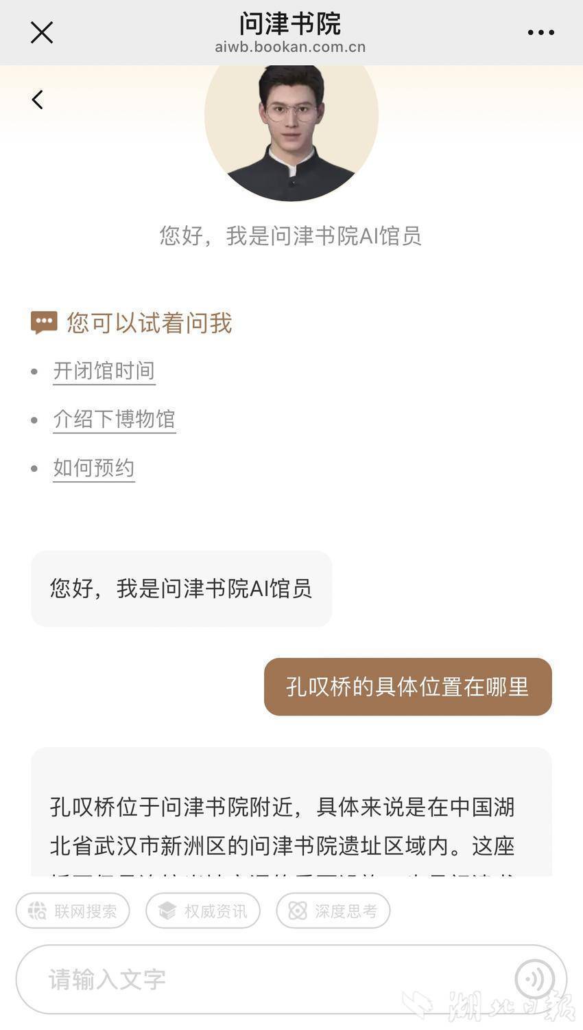 “請問‘子路問津’典故里的孔嘆橋具體位置在哪?”9月17日,武漢市新洲區(qū)問津書院里,來自孝感的歷史愛好者李女士掏出手機(jī),點(diǎn)開剛關(guān)注的“武漢市新洲區(qū)問津書院”公眾號,點(diǎn)擊下方主菜單“走進(jìn)書院”,再選擇“AI 館員”選項(xiàng),對著彈出的對話界面輕聲發(fā)問,三秒后屏幕上便給出了詳細(xì)的回復(fù)。這座因《論語》典故得名、被譽(yù)為“中國最古老大學(xué)”之一的千年書院,正因全新上線的AI館員服務(wù),開啟了傳統(tǒng)文化與現(xiàn)代科技交融的新篇章。