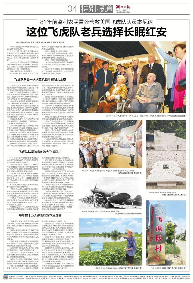 3篇見報重點報道之外,本次系列報道還格外注重全媒體全平臺傳播。湖北日報客戶端推出融合產(chǎn)品《“他是我們美國人,為什么會葬在中國?”》,圍繞美國學(xué)生艾利克斯的追問,以美國飛虎隊夏令營成員訪問李先念故居紀念園為引,以跨國人文故事為載體,采用AI+SVG技術(shù),通過長圖+視頻等方式,描繪美國飛虎隊老兵本尼達與中國軍民在抗戰(zhàn)中結(jié)下的生死情誼,重溫二戰(zhàn)時期中美聯(lián)合抗日的歷史記憶,展現(xiàn)血與火鑄造的中美兩國人民友誼。產(chǎn)品突破傳統(tǒng)戰(zhàn)爭敘事,聚焦個體命運與民間情感,內(nèi)容層層遞進,視覺制作精美,客戶端閱讀量4萬+,獲全省置頂推薦。