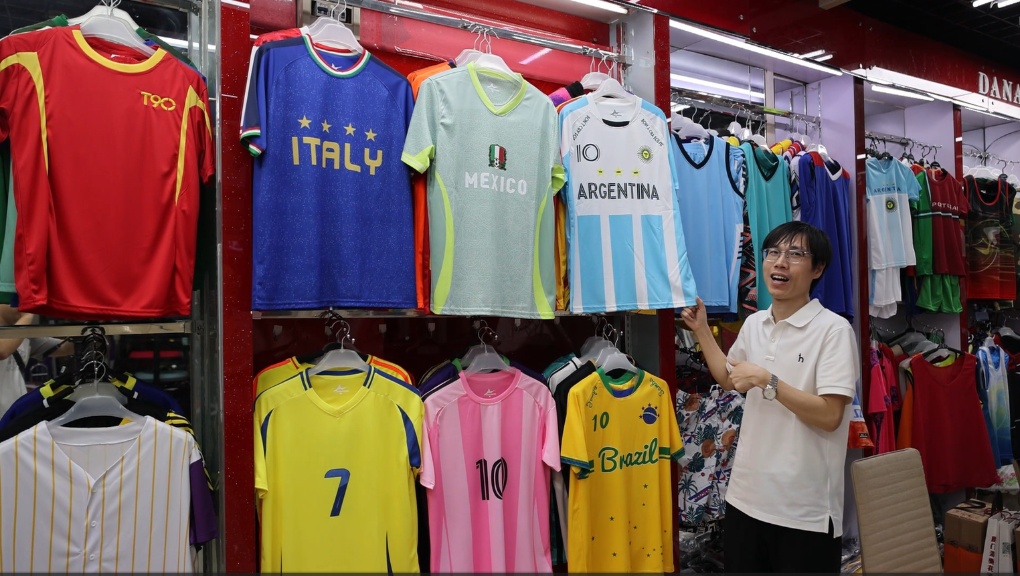 義烏國際商貿城經營戶溫從見展示他為2026年美加墨世界杯設計的原創球迷服。新華社發