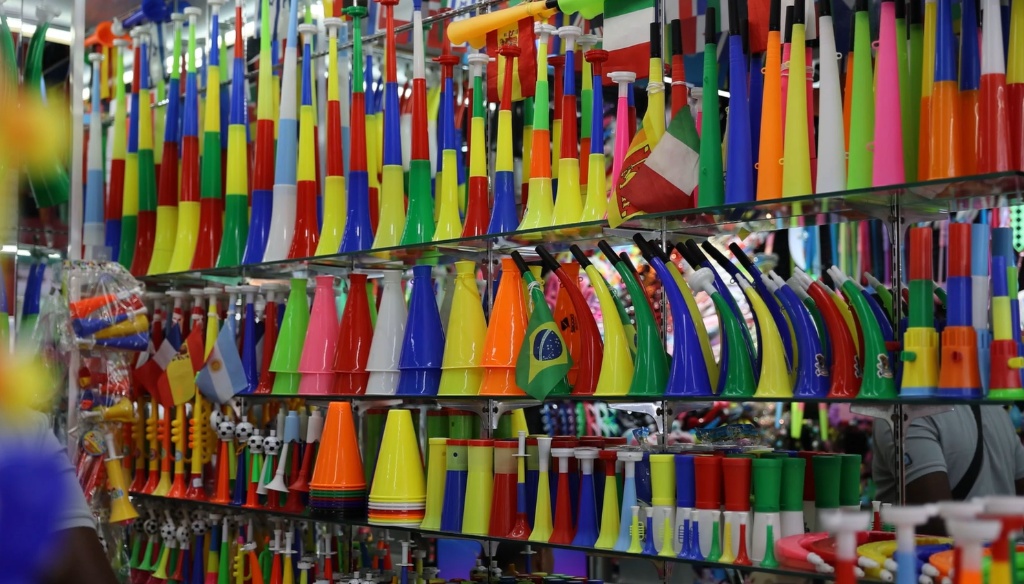 滿載著喇叭、旗幟和足球等商品的集裝箱卡車
