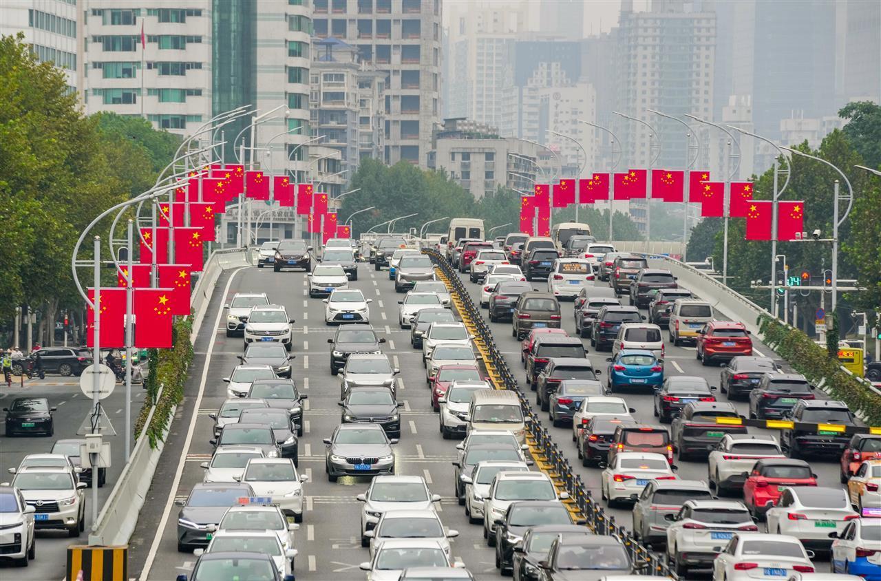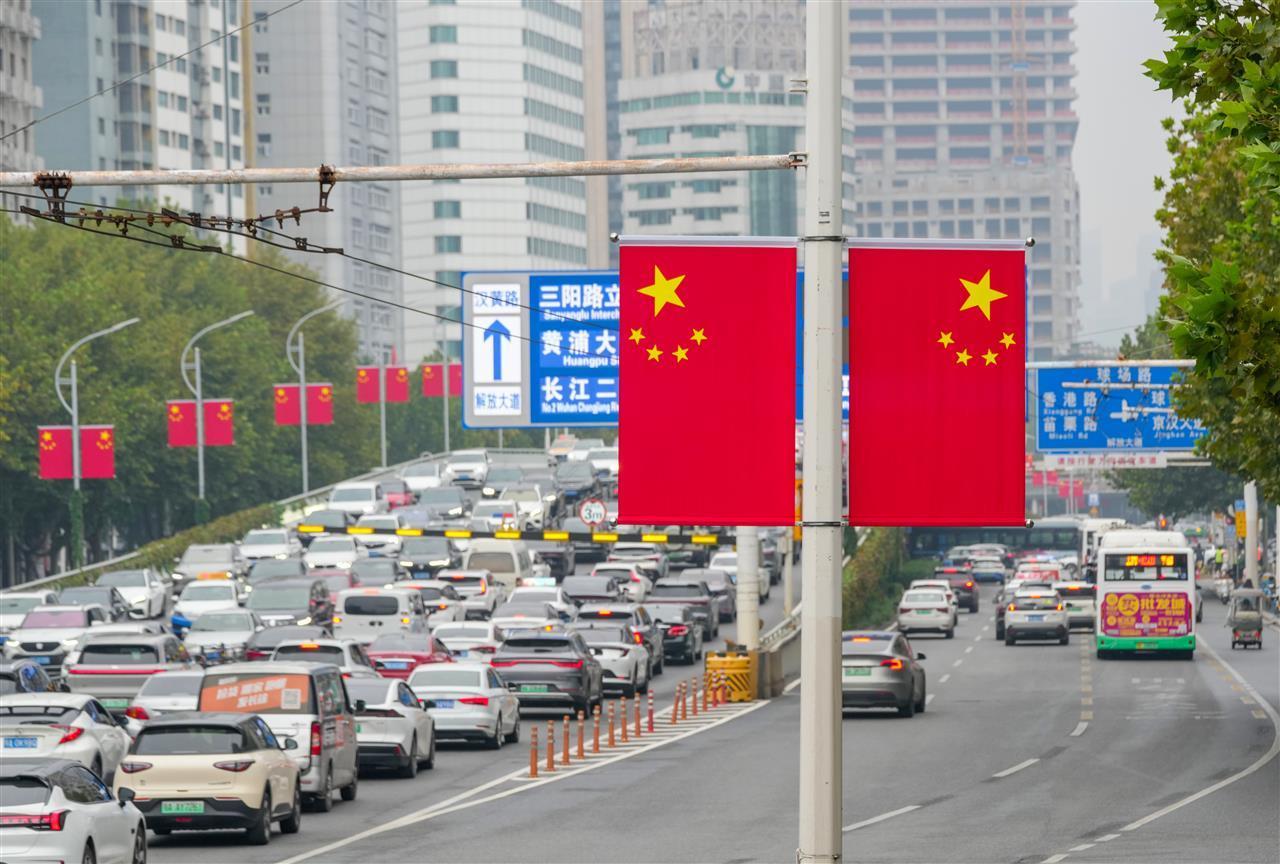 9月22日,在武漢解放大道及立交橋路燈上,掛上了一面面鮮艷的五星紅旗,未來幾天,街頭陸續懸掛國旗,武漢將全線飄紅。