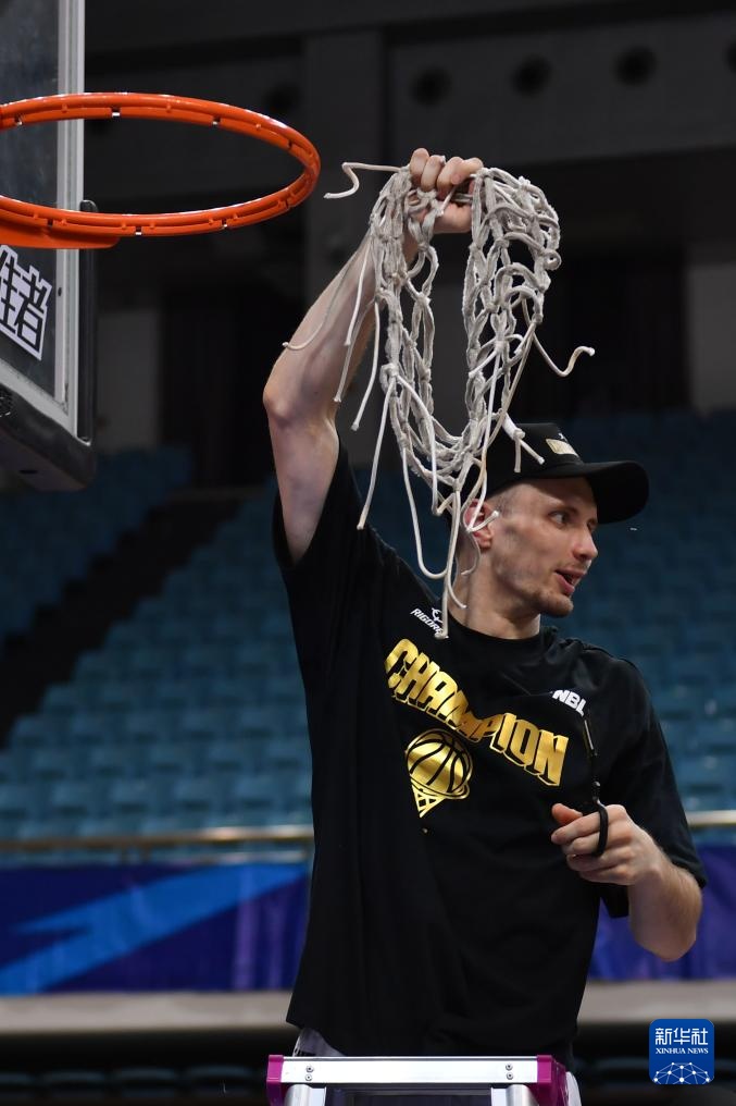 9月22日,香港金牛隊球員邁克爾·厄特爾二世在賽后剪下籃網慶祝。
