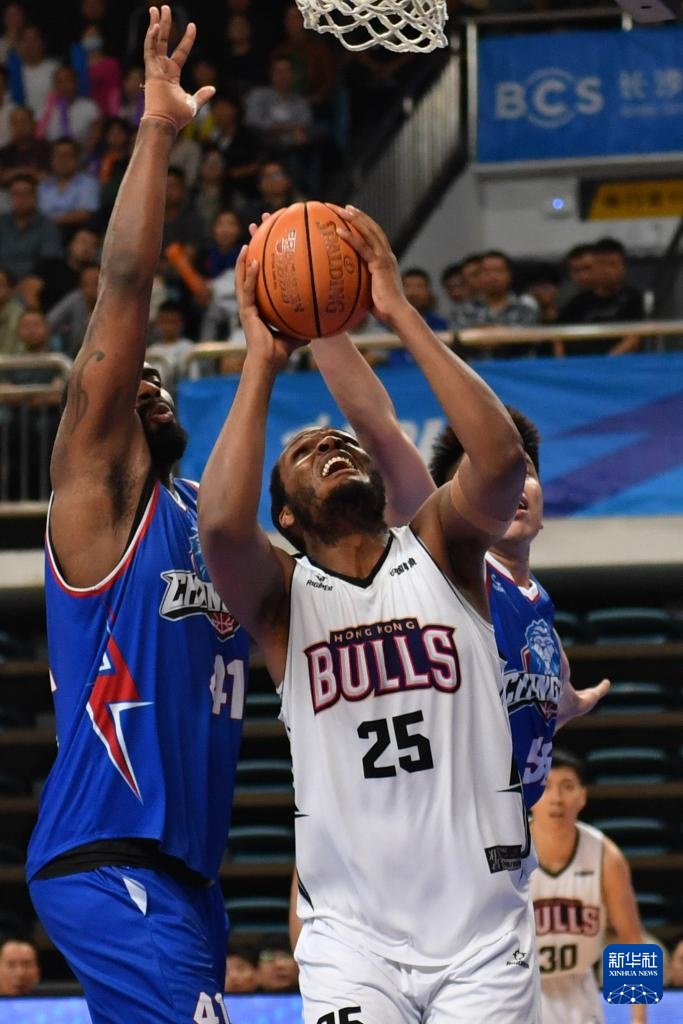 9月22日,香港金牛隊球員凱文·克羅斯(右一)防守長沙電信勇勝隊球員達卡里·約翰遜(中)上籃。