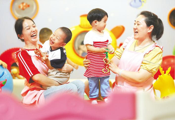 荊門市東寶區泉口街道瀏河社區托育服務中心,通過“媽媽崗”計劃實現就業的保育員正在和孩子進行趣味游戲。(視界網 趙平 歐陽萍 攝)