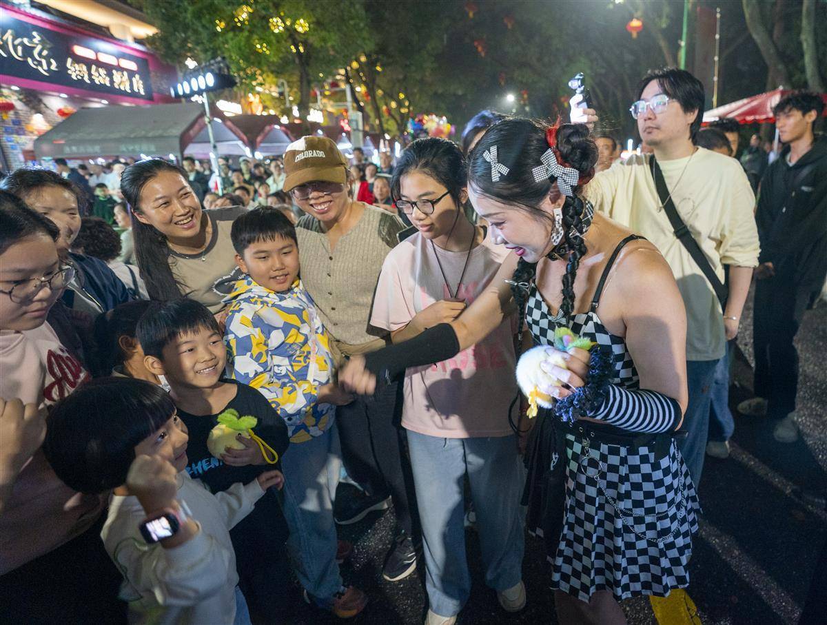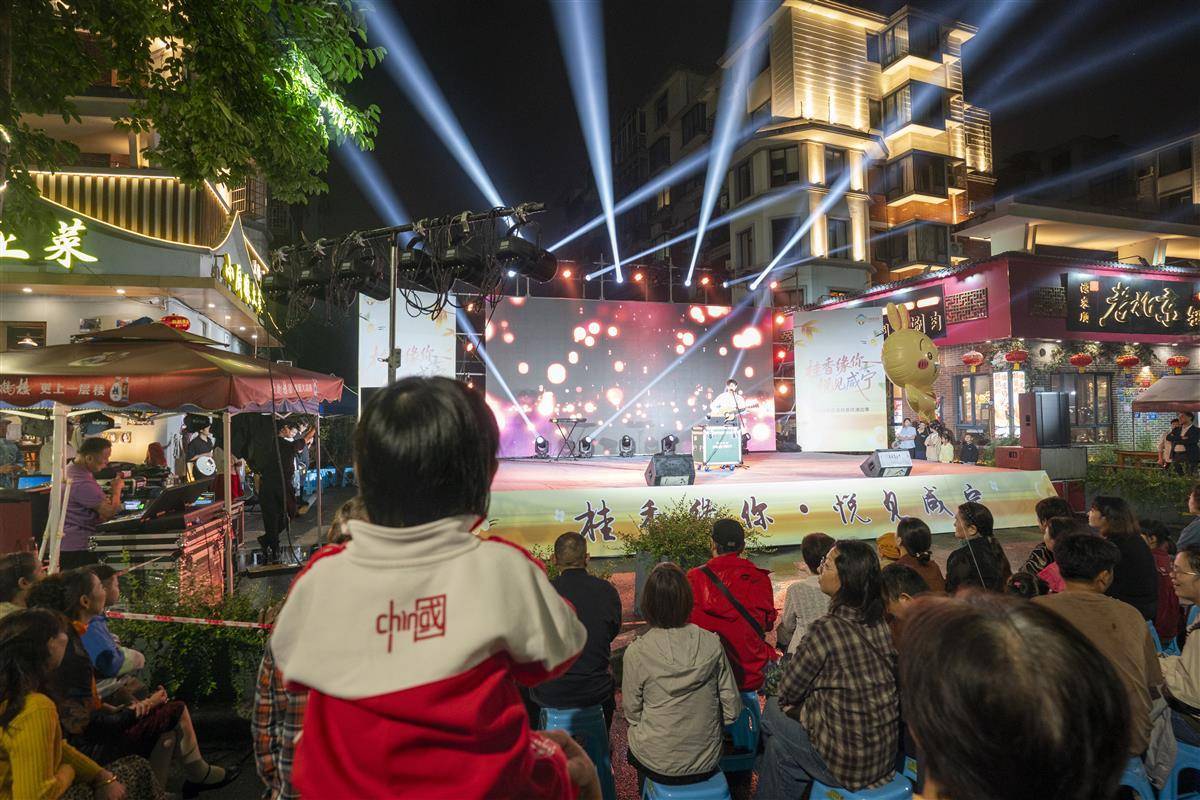 9月21日,咸寧市月亮灣特色街區(qū),市民、游客們欣賞文藝表演、品嘗美食。2023年春天,月亮灣主街道被納入升級改造范圍。沿街商戶們成立了月亮灣商戶自治委員會,號召大家誠信待客,共做“一桌席”。如今,這里已經(jīng)成為咸寧最具特色的打卡地標(biāo)。今年以來,咸寧市商務(wù)系統(tǒng)緊抓“誠信興商”這一主線,以信用建設(shè)促進(jìn)消費復(fù)蘇、釋放市場活力,取得了顯著成效。今年1至7月,全市社會消費品零售總額511.34億元,同比增長7.2%,增速位列全省第一,消費市場呈現(xiàn)“供需兩旺”的良好態(tài)勢。(湖北日報全媒記者 魏錸 攝)