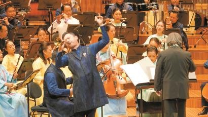 在第四曲二胡與樂隊《臥虎藏龍》之后,觀眾還沉浸在抒情性與戲劇性結合的悠揚余音中,“炸裂”的第五曲嗩吶與樂隊《鳳舞》來了。此前似乎隱身在樂團的嗩吶演奏家胡晨韻一邊演奏,一邊信步走到臺前,觀眾的眼神難以離開他和他的嗩吶,叫好聲在演奏中此起彼伏。一位年輕華人觀眾情不自禁用腳打起節拍,很快,全場都鼓起掌來打節拍。曲末胡晨韻一段循環呼吸法式的吹奏,仿若一氣呵成,持續數十秒,又一次點燃了現場觀眾。傳統的嗩吶、經典的《百鳥朝鳳》,就這樣與現代音樂元素共舞出蓬勃的生命力。