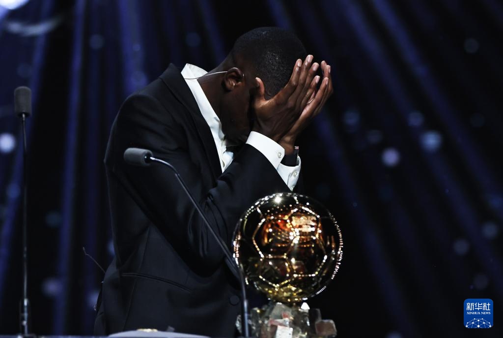 9月22日,巴黎圣日耳曼隊法國球員登貝萊在頒獎儀式上親吻獎杯。他獲頒男足金球獎。