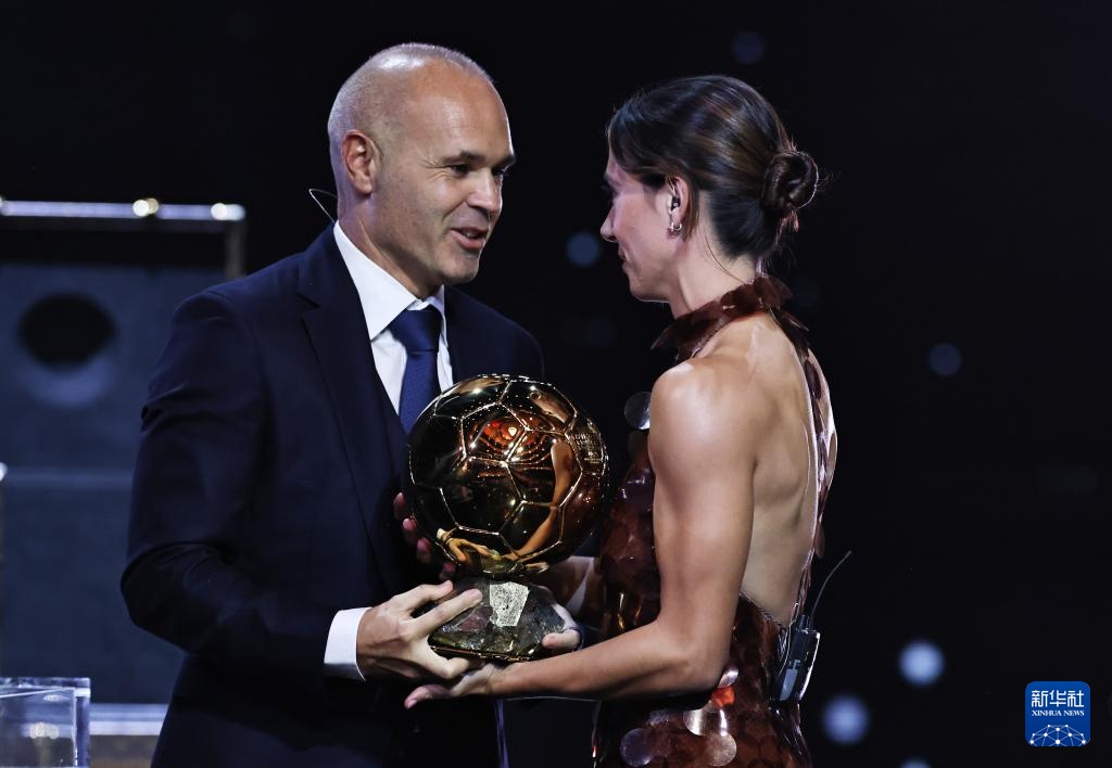 9月22日,巴塞羅那隊西班牙球員邦馬蒂(右)在頒獎儀式上從西班牙足球名宿伊涅斯塔手中接過女足金球獎杯。這是她連續(xù)第三年獲得該獎項。