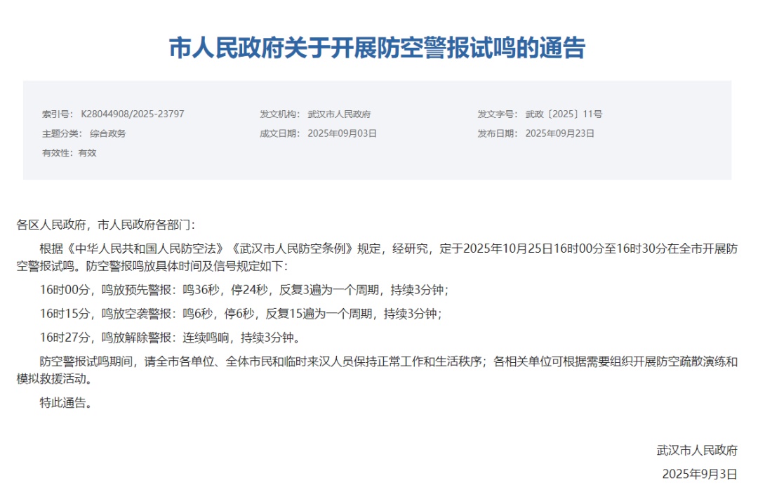 根據《中華人民共和國人民防空法》《武漢市人民防空條例》規定,經研究,定于2025年10月25日16時00分至16時30分在全市開展防空警報試鳴。防空警報鳴放具體時間及信號規定如下: